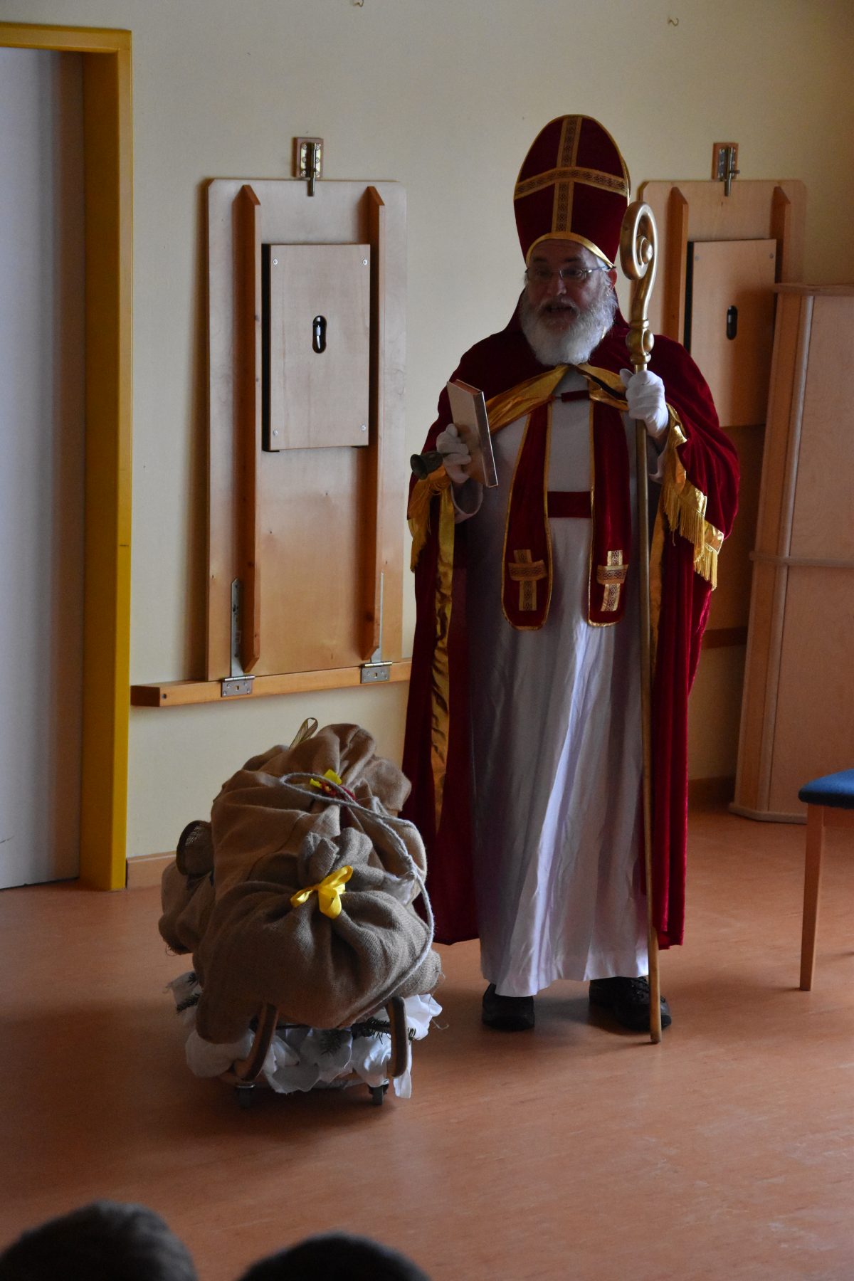 Voller Spannung warteten die Kinder im Mehrzweckraum auf unseren Nikolaus und als es dann klopfte und er mit seinem Schlitten zu uns kam, ging ein großes Raunen durch den Raum. Auf dem Schlitten war für jede Gruppe ein Sack, gefüllt mit Socken, welche die Weihnachtswichtel mit Leckereien gefüllt hatten. Natürlich haben wir dem Nikolaus Lieder gesungen, mit ihm getanzt und einige Kinder hatten ihm tolle Bilder gemalt. Danke lieber Nikolaus!
